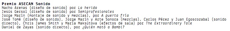 El Sonidista Dani de Zayas ganó un Goya al Mejor Sonido por la película «Tres Días» y dos nominaciones más en los premios de la Academia. Este mismo año ha ganado, por segunda vez consecutiva, el premio ASECAN al mejor Sonido por: «¿Quien mató a Bambi?».
